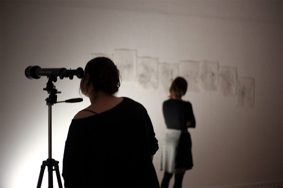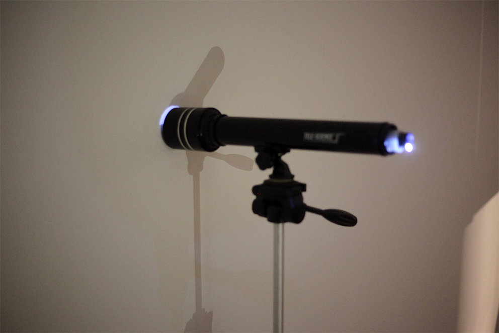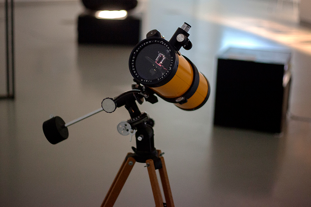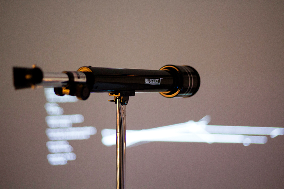 Le télescope, en tant qu’un des symboles épistémologiques du XVIIe siècle, est interrogé au sein de cette installation qui compte trois télescopes à fonctions détournées. Le premier présente une interprétation sonore des relevés des corps célestes donnée à écouter dans un appareil à usage visuel. Le deuxième recèle en lui un microscope et un échantillon de tissu vivant qui, agrandi plus de 1200 fois, ressemble à la représentation d’une nébuleuse. Enfin, le troisième télescope efface le traditionnel « objet de recherche » en le remplaçant par le sujet lui-même : un jeu de lentilles et d’éclairage permet au spectateur de voir à l’intérieur de son propre œil.