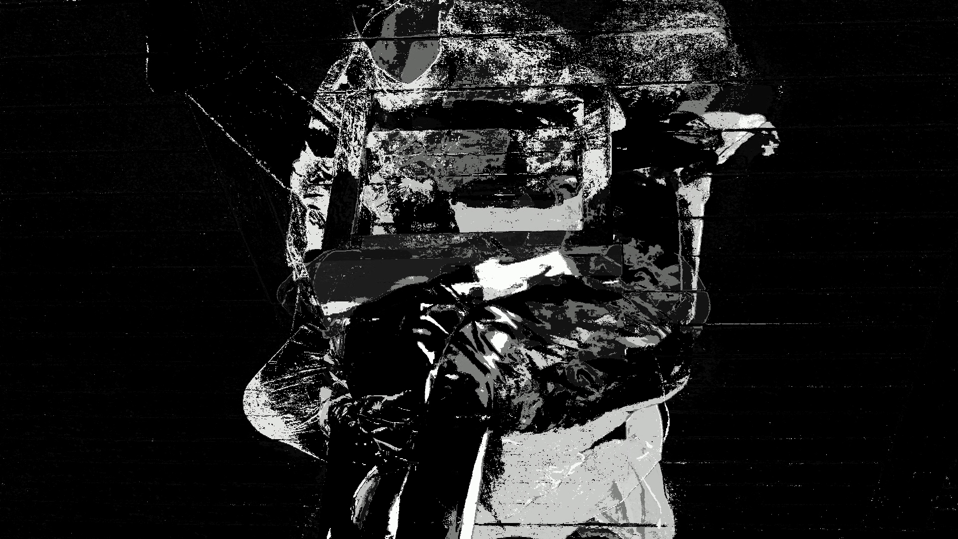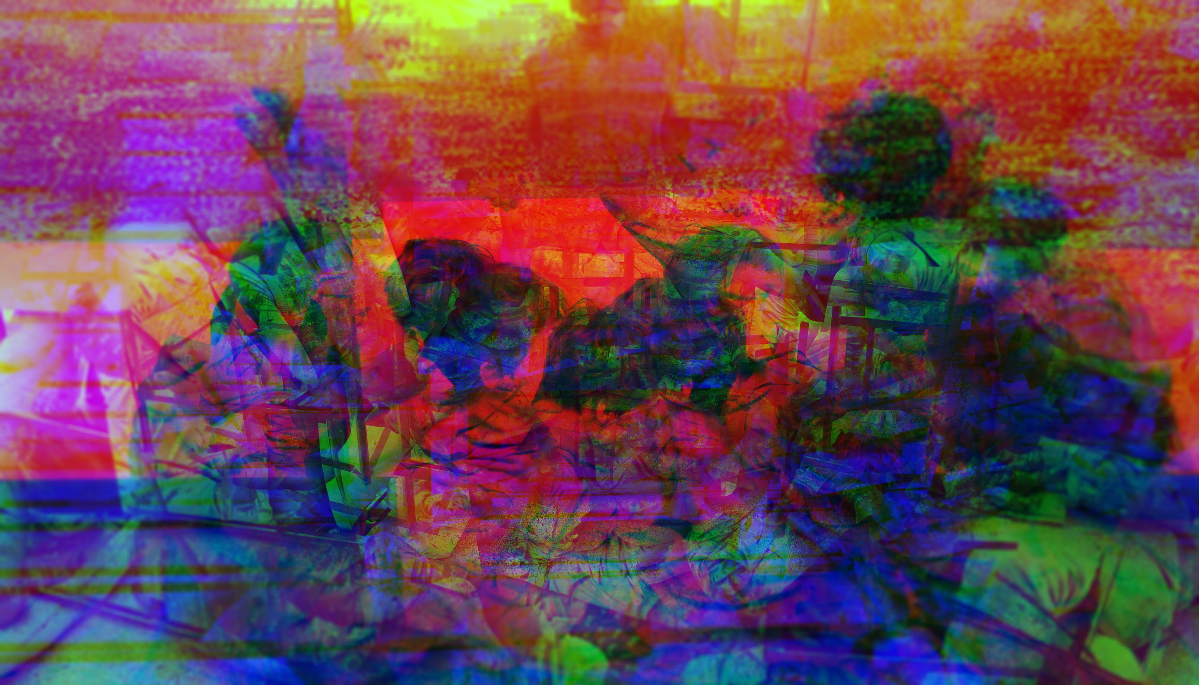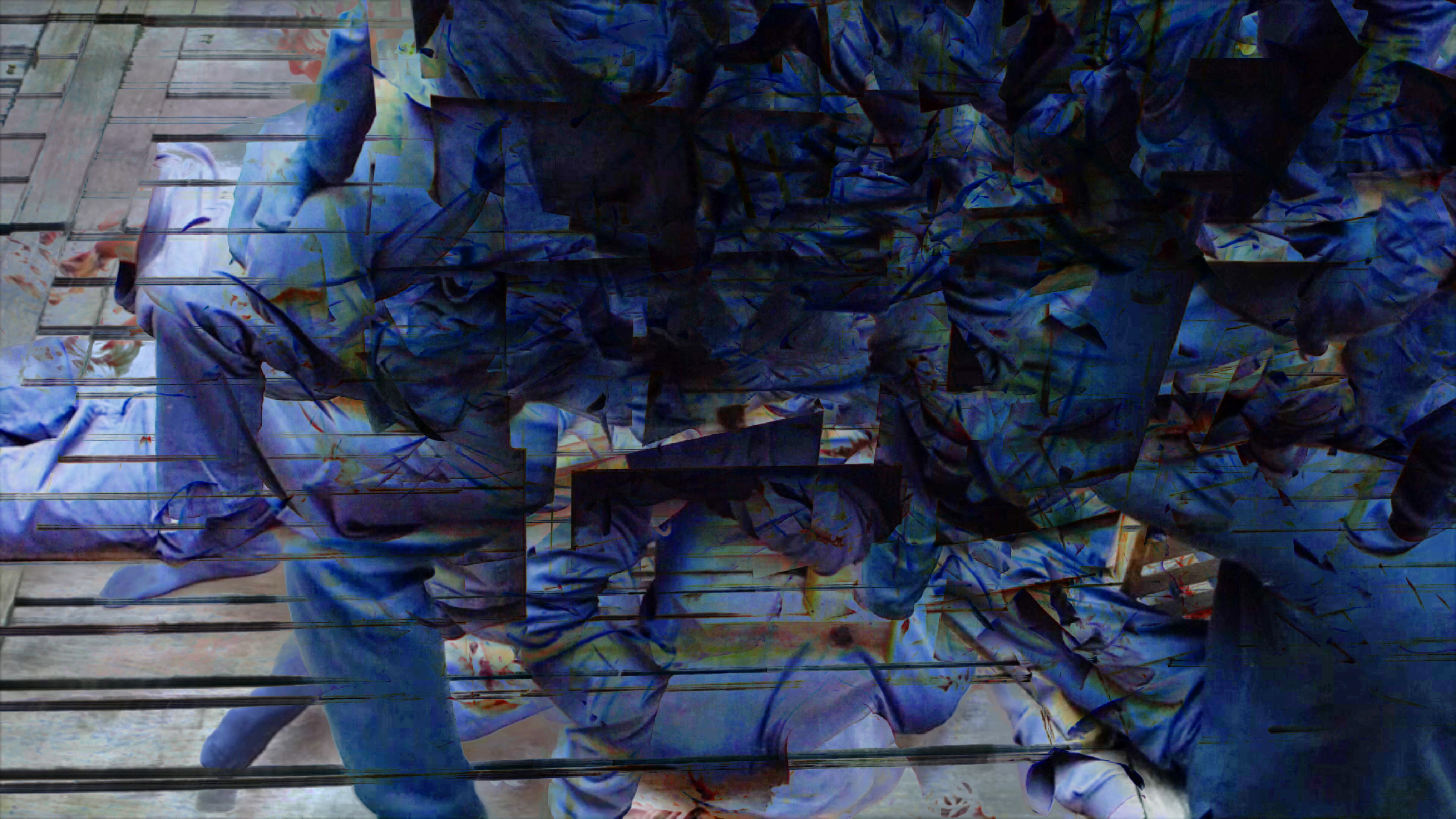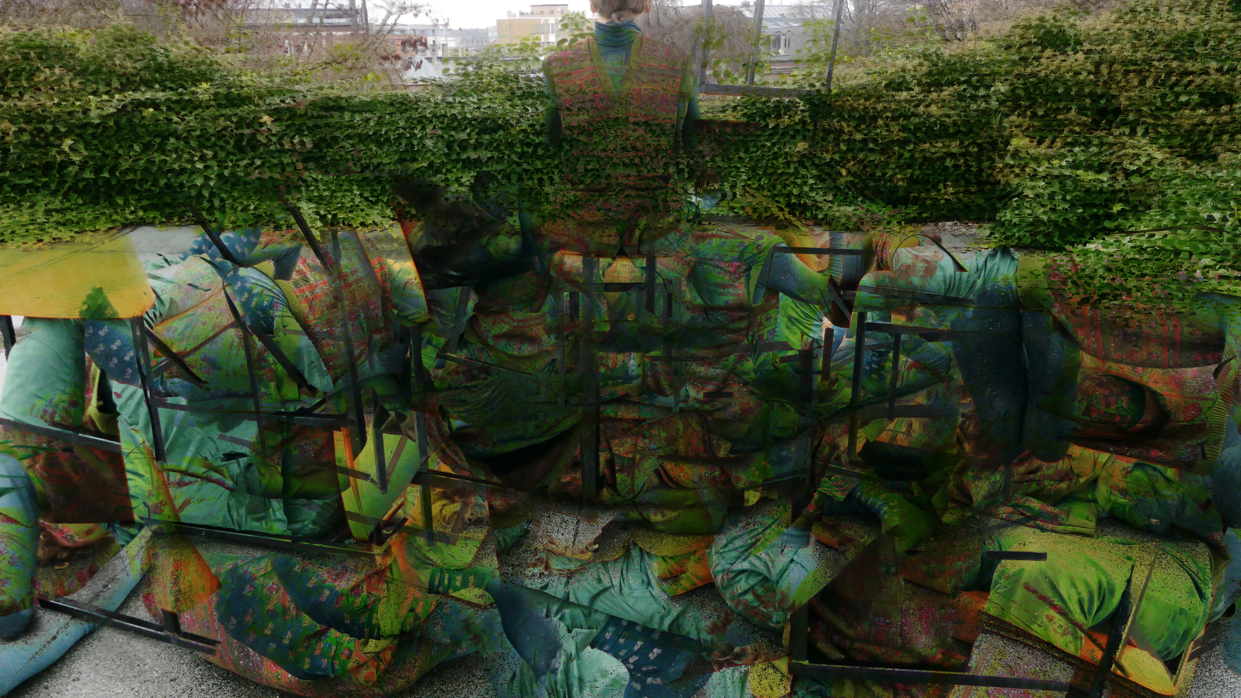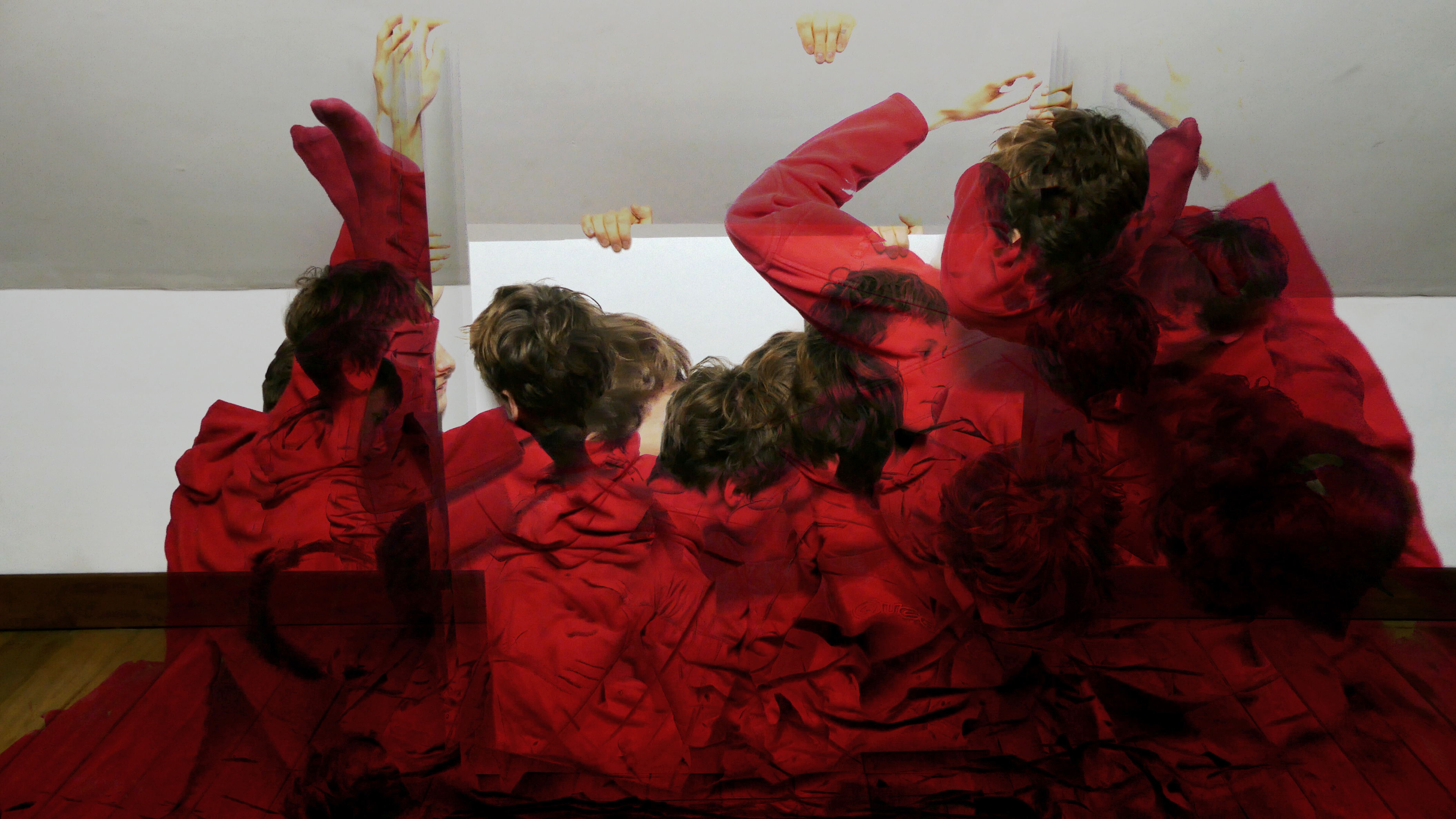 Dans RGB l’espace est structuré selon deux principes testés lors d’une performance chorégraphique : celui de la couleur et celui du mouvement. Premièrement, le mouvement dans l’espace est tramé par trois objets différents (un châssis, une chaise et une table). Deuxièmement, en ne captant que la couleur la plus présente (rouge, vert et bleu respectivement) le mouvement est figé dans l’espace de la performance et reste sans cesse rebalayé et transformé avec le nouveau passage. Ensuite, à l’aide du capteur de mouvement (vidéo capture sur python), seules les traces des mouvements en couleurs sont retenues. Finalement, les trois performances filmées deviennent chacune une chaîne de couleur (Rouge, Verte et Bleue) pour produire une image synthétique. Ces métamorphoses de l’image par la couleur et par le mouvement génèrent et regénèrent sans cesse une combinaison différente dans l’espace interrogeant ainsi les sens principaux de la cognition spatio-visuelle.