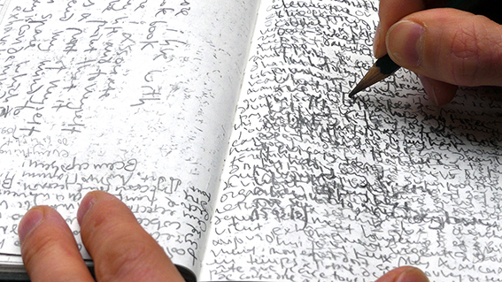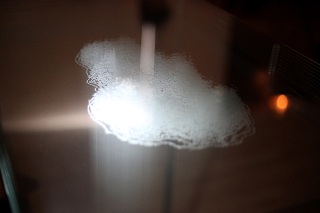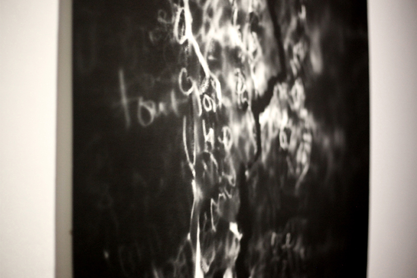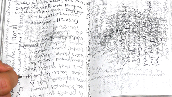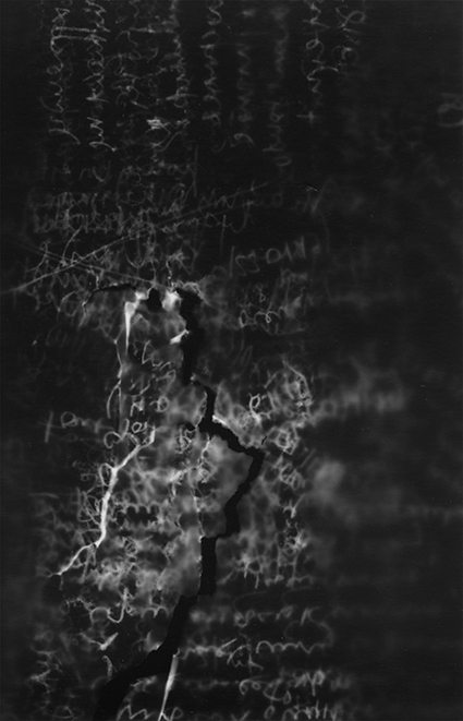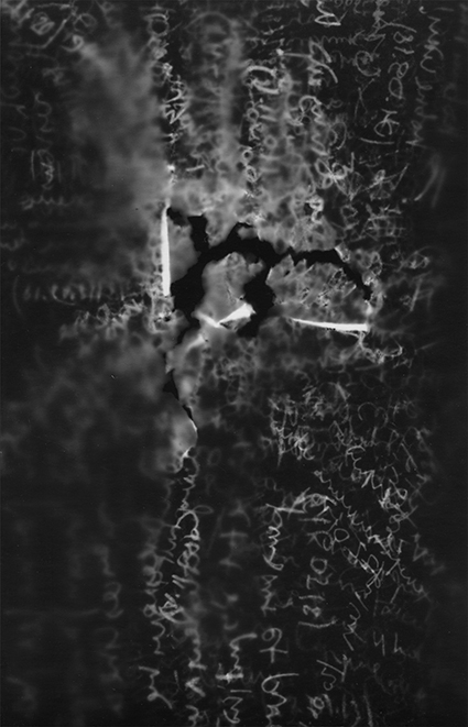 Wanderer’s Diary interroge la physicalité de l’écriture et, notamment, celle de sa dimension sémantique. Un journal tenu pendant un an, investi par une écriture régulière et quotidienne sous formes poétiques et philosophiques n’a d’autres règles que celle de superposer les phrases et les mots avec ceux qui correspondent à leur espace sémantique. L’expression sémantique du texte s’efface au fur et à mesure mais elle laisse derrière elle une forme physique générée par le sens des mots. Un tirage de photographies argentiques produites par contact avec les pages du journal est réalisé ensuite pour en révéler des cartes de ces paysages sémantiques. Enfin, gravés couche par couche sur les plaques de verre, ces paysages deviennent d’autant plus physiques dès le moment où ils peuvent être pratiqués dans l’espace.