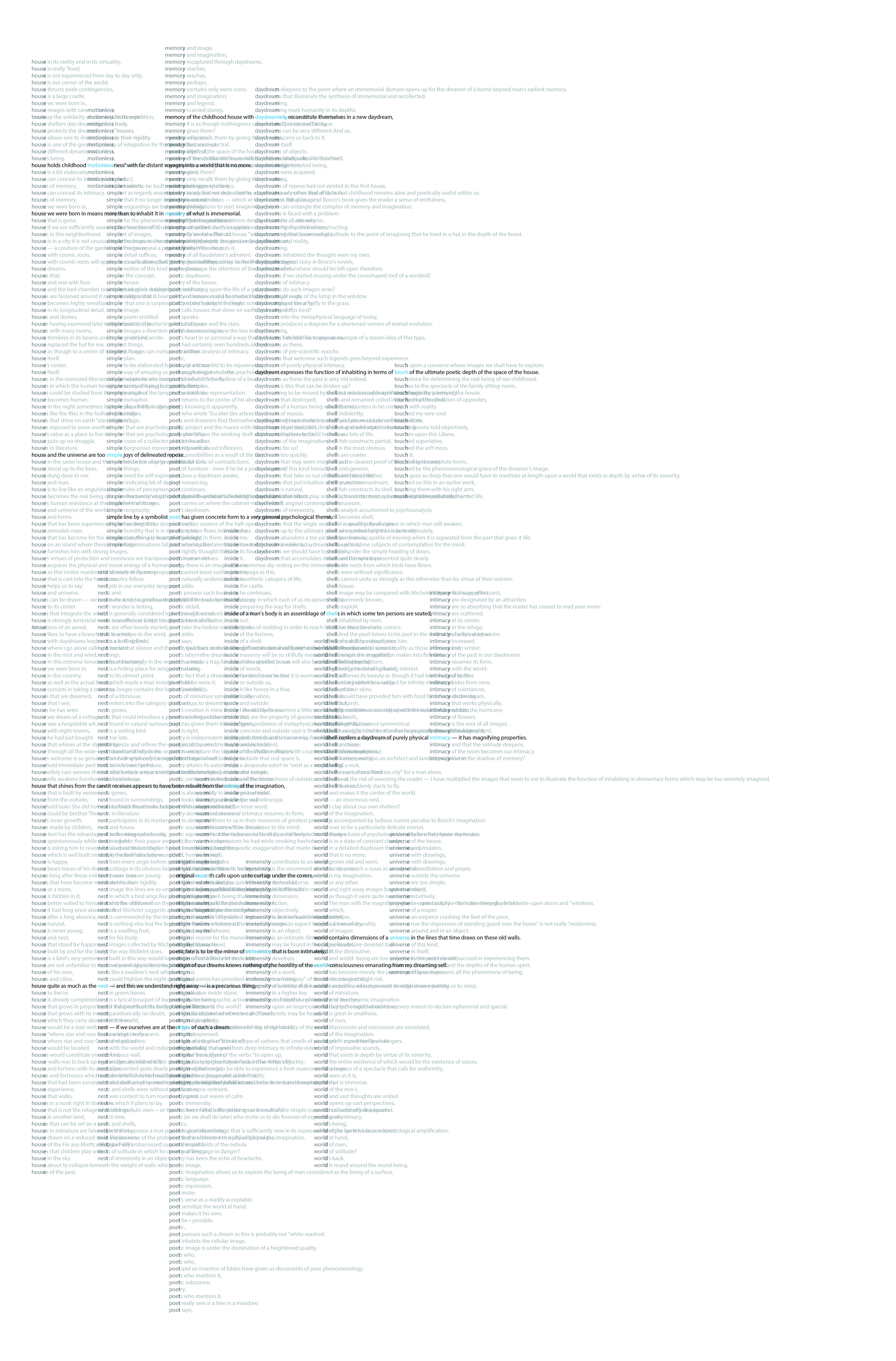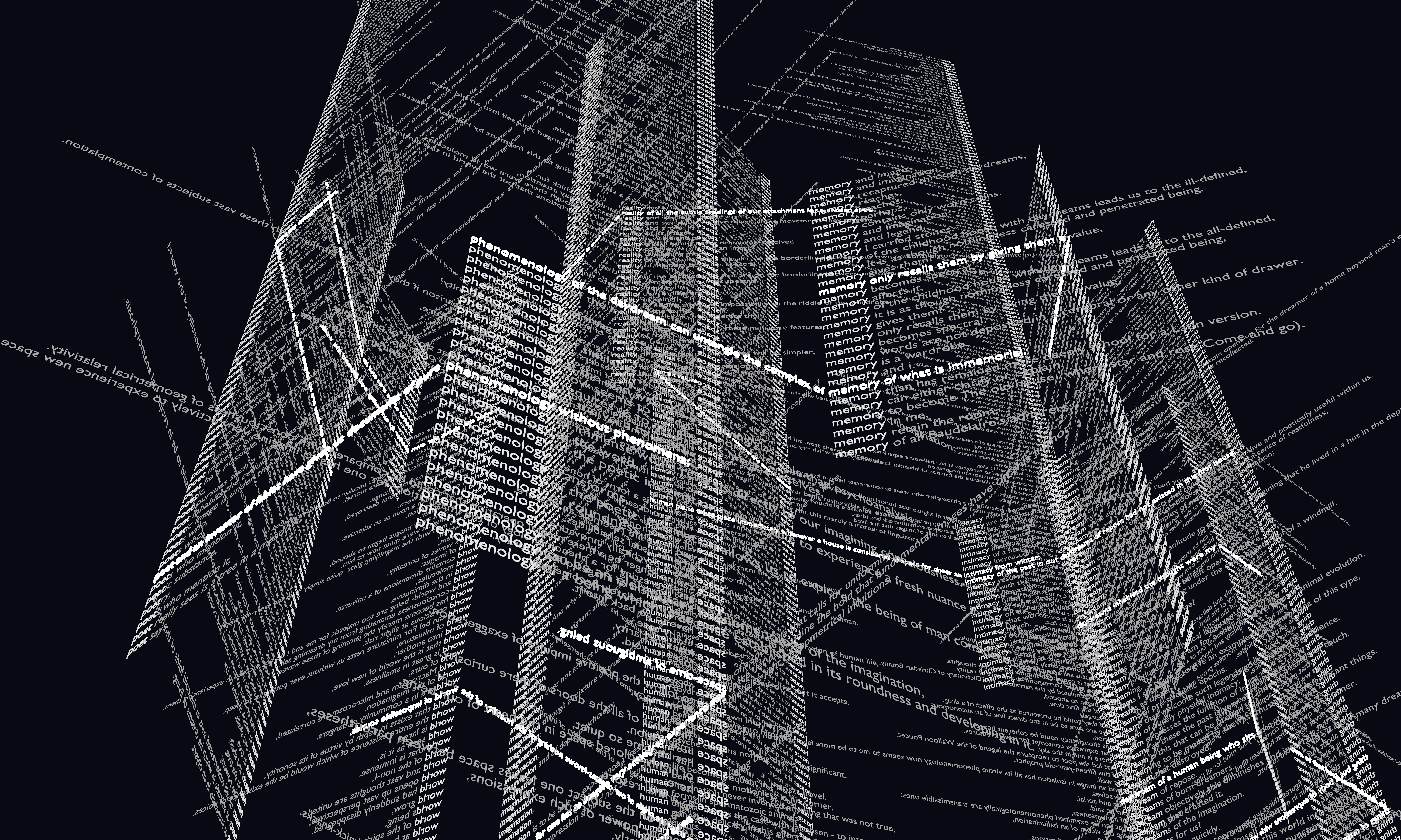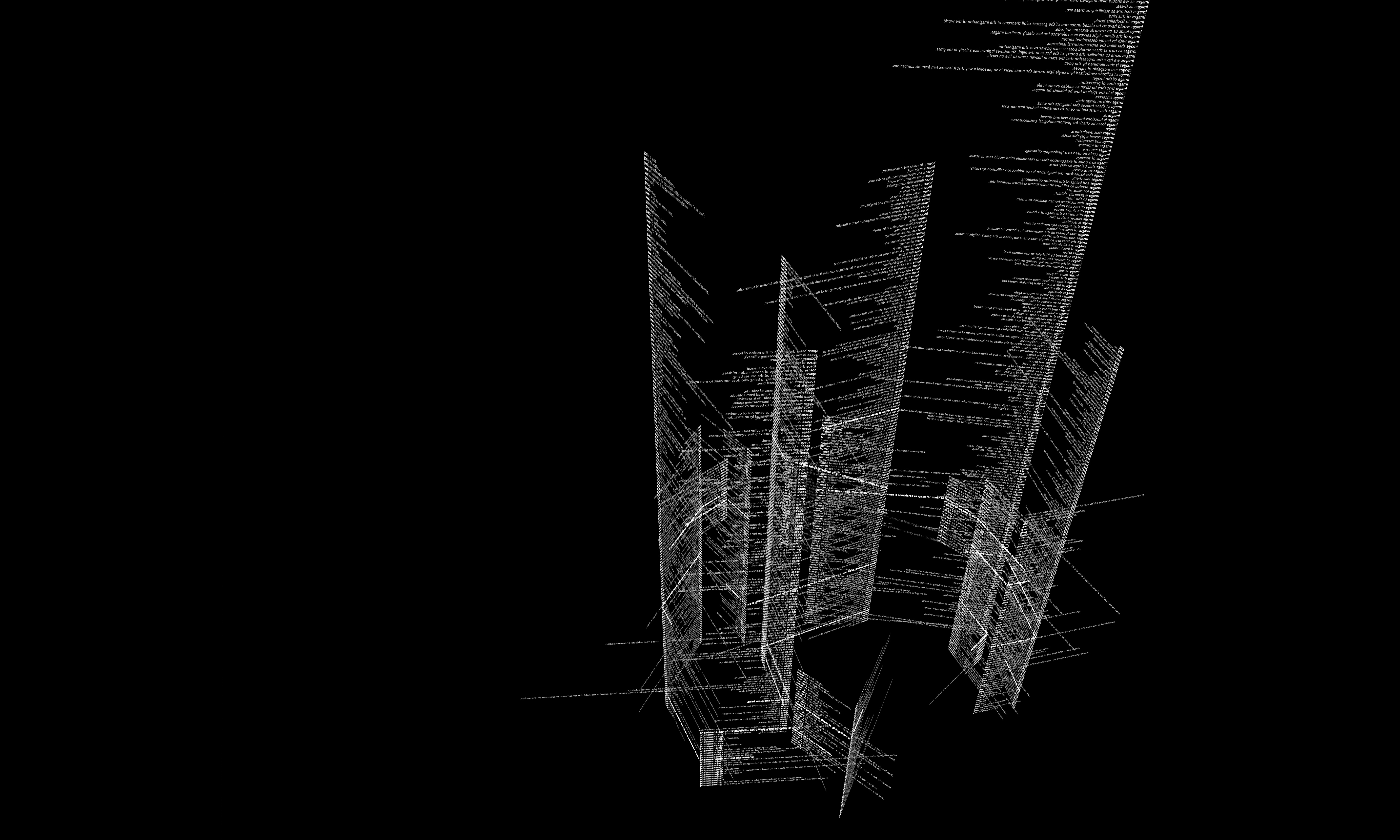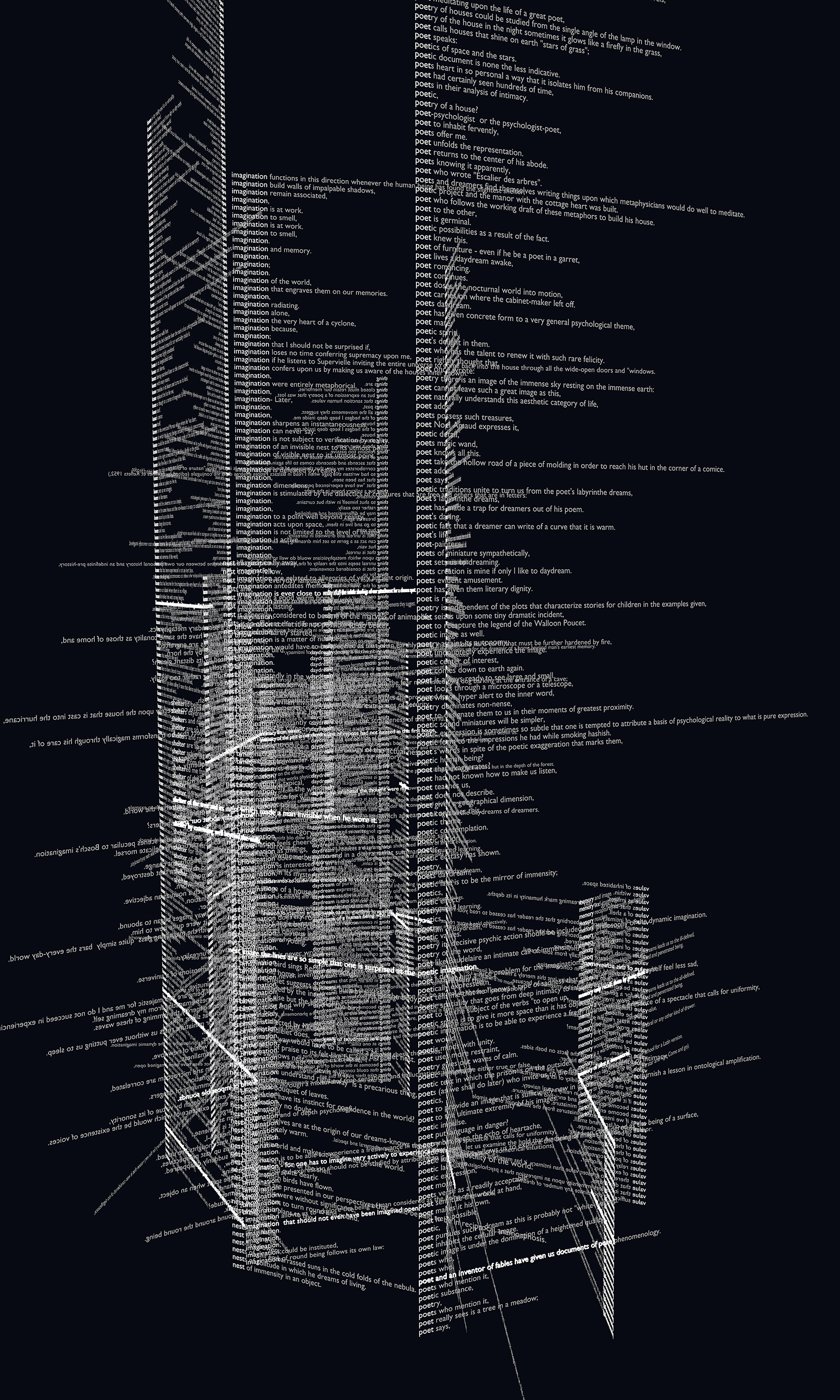 Il n’y a pas ou peu d’hiérarchie formelle dans un texte classique lissé par l’énonciation éditoriale. Néanmoins, dans l’architecture la hiérarchie proportionnelle et matérielle est une des conditions fondamentales. Pour ne pas suivre le trajet hypermédiatique mais en même pour sortir The Poetics of Space de son support original (le premier chapitre de La Poétique de l’Espace de Gaston Bachelard intitulé La maison. De la cave au grenier. Le sens de la hutte.) l’écriture prend forme d’un labyrinthe généré d’une manière semi-automatique par des algorithmes statistiques sur python. Ce chapitre interroge la phénoménologie de l’espace intérieur de la maison, le sens et le sentiment de l’habitat que nous lui assignons. Pourtant, en visitant le labyrinthe nous ne visitons pas la maison mais l’idée de la maison. Il n’y a plus de différence qualitative entre les colonnes des mots les plus fréquents générées à partir du text qui en constituent les piliers. En revanche, c’est la différence quantitative d’utilisation des mot-clés qui met en forme l’expression statistique du texte. Enfin, les piliers, à leur tour, sont orientés vers quatre pôles sémantiques principaux interrogés dans le livre (corps, esprit, lieu, univers) pour former un parcours sémantique altérée par cette déformation génétique du texte original. Le glissement physique que nous pratiquons lors que l’on visite le labyrinthe provoque également un glissement sémantique en connectant les piliers entre eux et en permettant un autre type de circulation dans le texte.